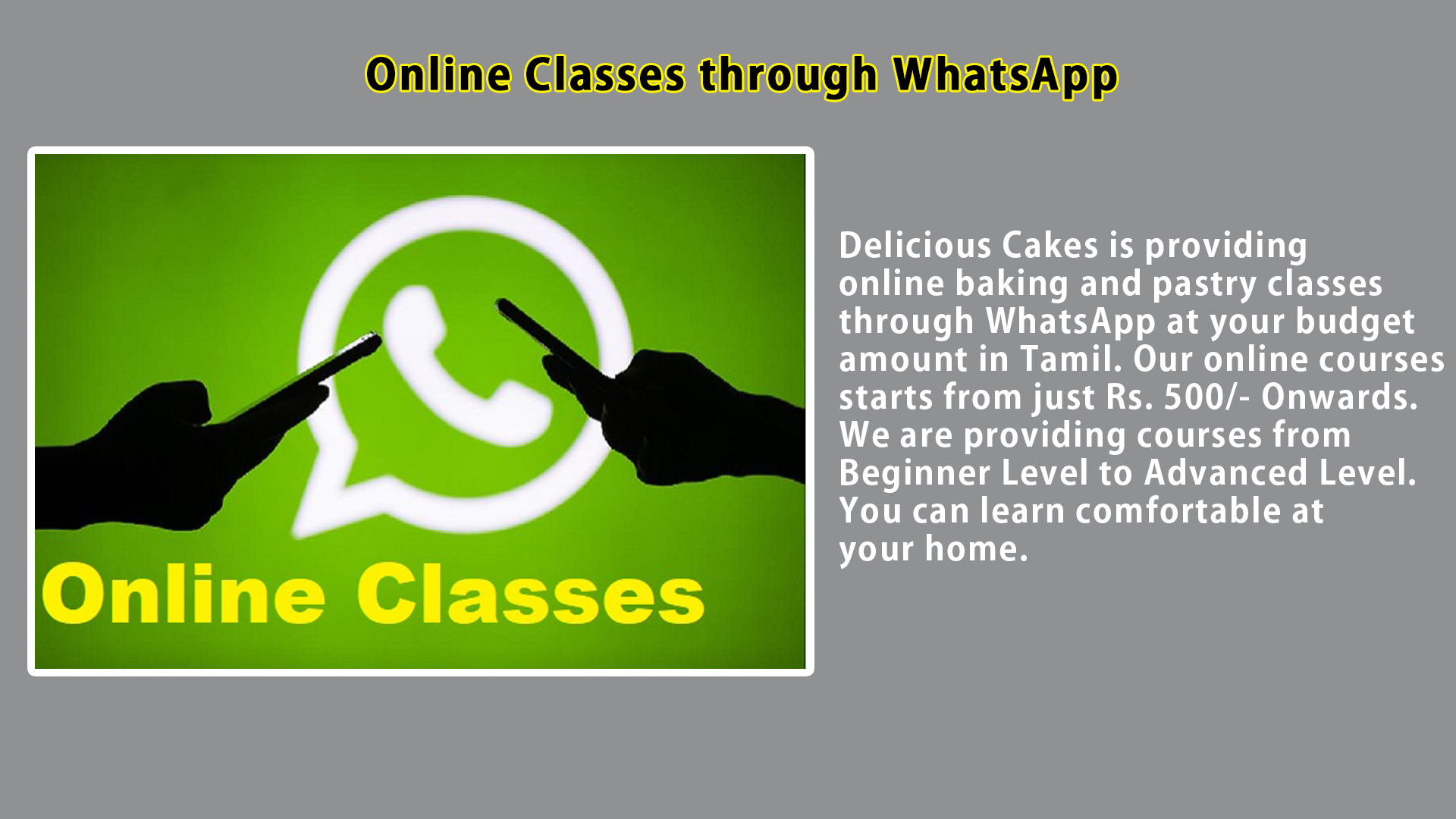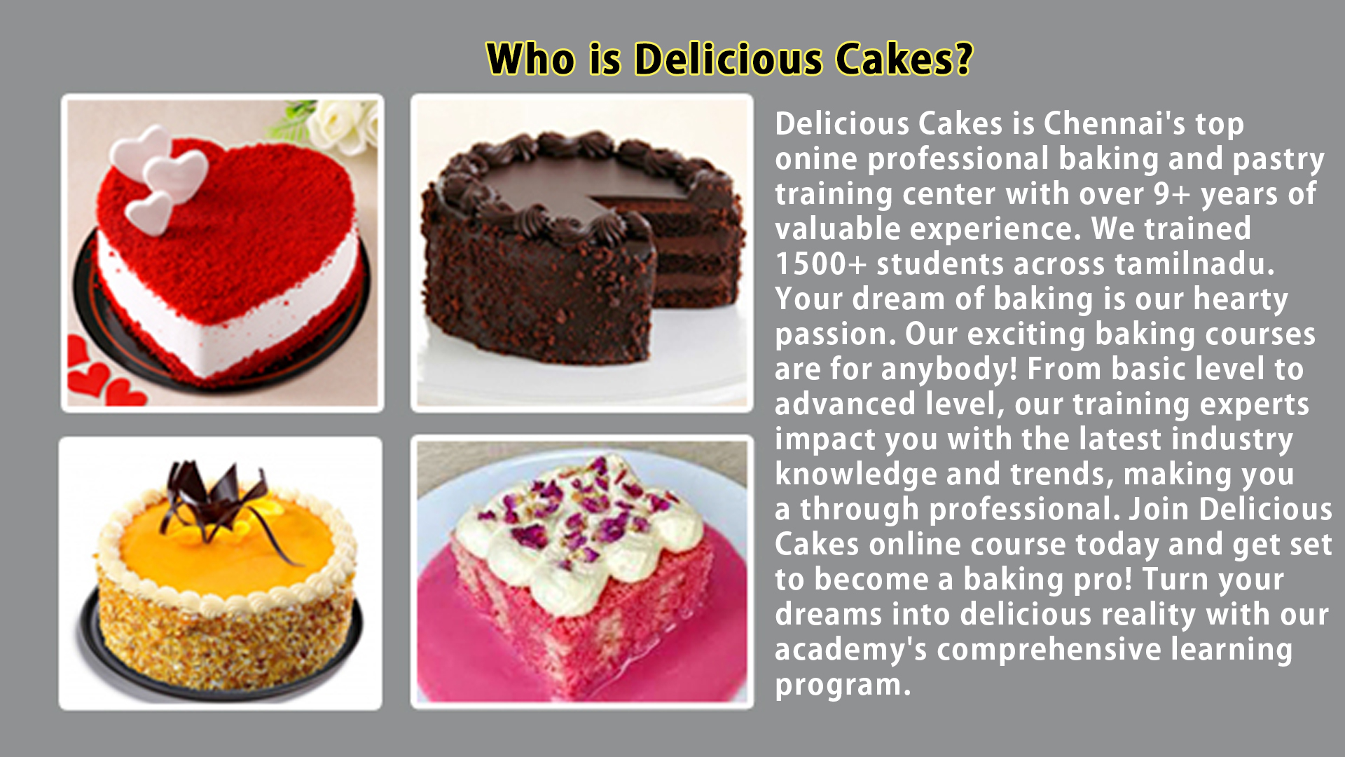 I'm studying 8th Std. but i got fear that can i learn the baking course? but Delicious Cakes took the confidence to me. At Present i'm doing cake business in my area.